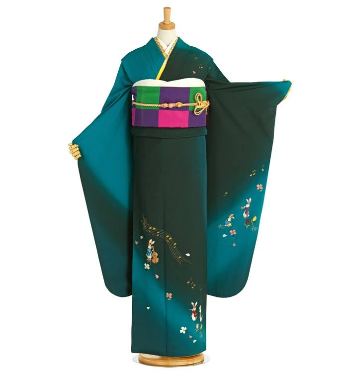 青緑のボカシの地に、楽器を演奏するうさぎやアヒル、音符などが刺繍で表現された振袖。カラフルな市松文様の帯と合わせた印象的な一着。
